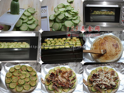 2、切好的西葫放烤盘中,中层上下火180度烤十分钟左右(让西葫先脱一下水水,烤好以后的披萨才不会显得太软)。