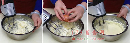 4、逐个加入鸡蛋,与奶酪糊完全融合。