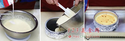 3、如果用活底模具,必须包上锡纸,不然水浴烤制的时候底部会进水,蛋糕烤好后不要立即脱模,冷藏几小时后再脱模切块食用,口感最佳。[LaoYanHuo.com]
