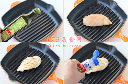 2、烤盘上刷上一层植物油,等到锅子惹到7-8分时候,放入鸡胸肉煎烤到熟、然后切成条状。