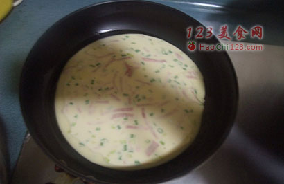 3、平底锅放少量的食用油,放入部分香葱培根蛋糊,成圆形薄饼(图3)。