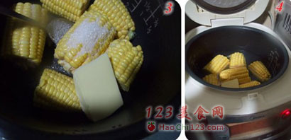 4、加入没过玉米的清水,按下电饭煲的煮饭键(图4),电饭煲工作完毕就可以吃啦!
