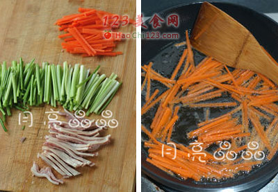 2、锅烧热放油,油温烧热放胡萝卜丝,煸炒至身软。