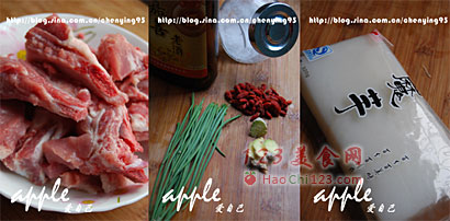 2、锅中放清水及姜片,焯一下排骨,捞出。