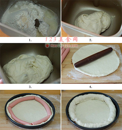 5、把饼皮放入烤盘内,在周围摆上细火腿肠。