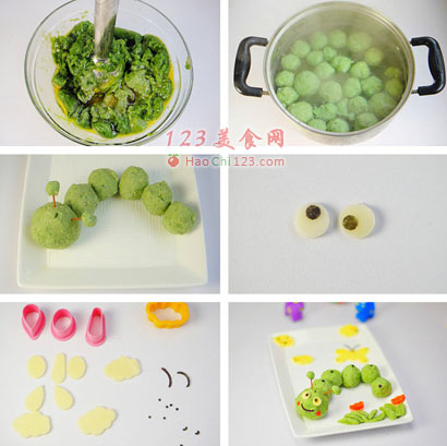 4、煮熟的丸子在盘子里组合成毛毛虫,面条在炒锅里用少许油煎熟,插在毛毛虫的头上做触角,上面扎上两个小丸子。