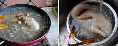 8、如若卤汁不能完全浸没鸭身,在卤制过程中要注意将鸭身翻面,以使酱色均匀鸭肉入味均匀。