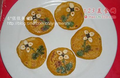 5、分成小团,搓圆再压扁成南瓜饼,压上杏仁、香菜叶、黑芝麻。