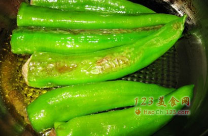 4、煎锅加油,把尖椒两面都煎出虎皮的效果。