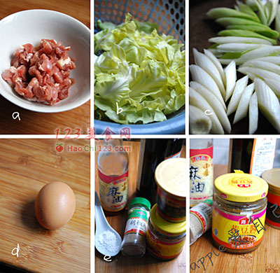 2、大葱洗净斜刀、卷心菜洗净用手撕小块。