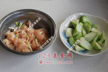4、锅里不用倒油,直接倒入丝瓜块。翻炒几下,淋入适量清水,水量能掩住丝瓜即可。