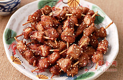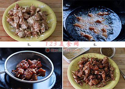 3、趁热再撒点孜然粉和五香粉增加香味,白芝麻趁热撒这样能完全沾在肉的表面。[LaoYanHuo.com]