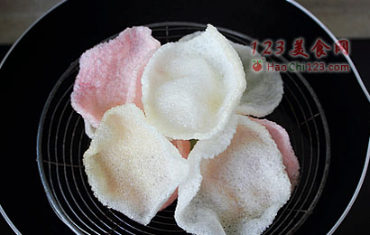 4、锅里油热后,下入虾片,炸开后捞出沥干油,一旁备用。