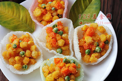 7、最后将胡萝卜和豌豆放入,翻炒均匀后即可出锅,用虾片做容器盛玉米粒。