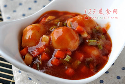 5、倒入煮好的虾丸(连汤汁),加两大勺番茄酱、一勺白糖、少量盐和鸡精翻炒均匀。