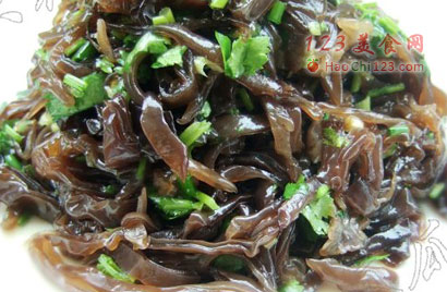 2、木耳切细丝,加入香菜和香葱段、香油(稍多些)、盐、味精,拌均即可。