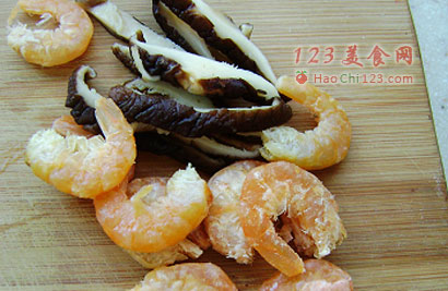 2、香菇切丝,焯水,虾干略微用水泡泡。