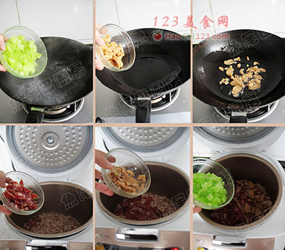 4、如果嫌麻烦,也可以将所有材料一次性倒入电饭煲中一起煮。