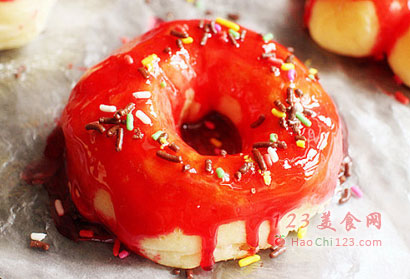 12、将微温的甜甜圈沾附热糖浆,共沾两到三次(或用淋面的方式)后,趁糖浆温热时洒上巧克力米沾附,完成。