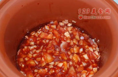 4、电炖锅底部铺上刚才切好的一半洋葱碎和番茄碎,上面一层再放肉,再上面一层铺上剩下的一半洋葱番茄碎,最上面浇上刚才调好的酱料。