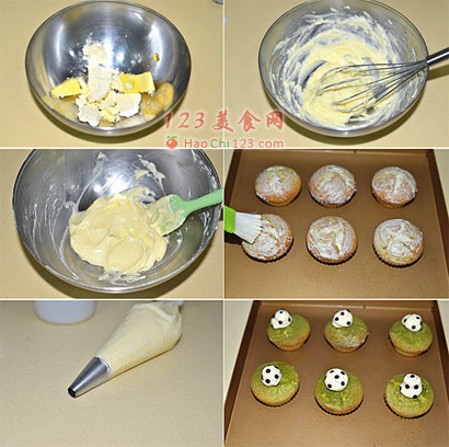 6、刷了奶酪糊的麦芬先筛上一层抹茶粉,在用裱花袋在顶端顶出一个圆球,将巧克力插进小球,做成足球的样子就可以了。