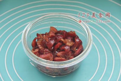 7、将步骤5中的原料加樱桃丁和原味酸奶放入搅拌机中搅打均匀,再将其放入冰箱冷藏室内冷却到5-10度。