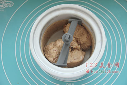 8、将冰淇淋桶从冰箱冷冻室中取出,将冰淇淋桶安装到面包机中,将搅拌叶安装到搅拌轴上。取出冷藏好的原料并将其缓慢倒入冰淇淋桶中,盖上桶盖,关上面包机上盖。