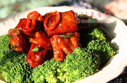 7、排骨炖得剩余少量水时,加入适量的冰糖,等糖融化后收汁,加入青红辣椒圈和葱粒,翻炒一下(图9),即可放在盛着西兰花的碟子里面。
