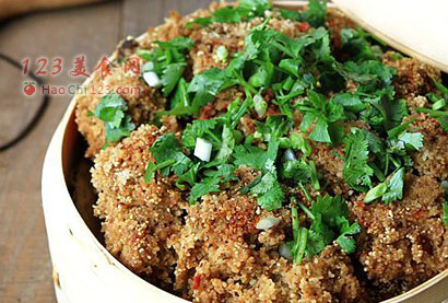 7、裹上小米末的排骨放入竹蒸笼中,隔水蒸。