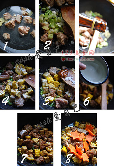 4、放玉米,炒至玉米断生(一定要断生后放调料),此刻差不多锅中的料酒及水分也耗去了。
