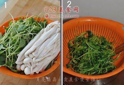 3、焯萝卜苗的水再次烧开,倒入海鲜菇焯水一分钟左右,捞出冲凉待用。