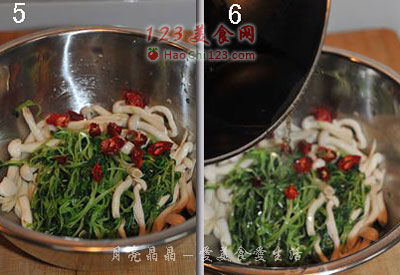 4、焯好水的萝卜苗和海鲜菇,放大碗里,放一小勺盐、一小勺白糖、一小勺香醋拌匀。