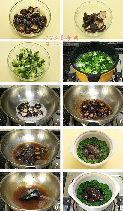 8、将西兰花围边码入砂煲中,中间放入香菇和海参。
