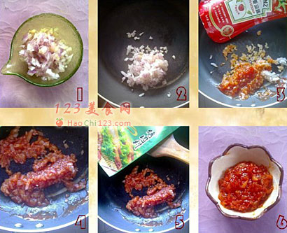 3、小火慢慢煎,待洋葱散发出香味,加入番茄酱。