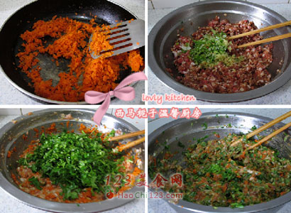 9、肉馅中,加入炒软胡萝卜碎和香菜。