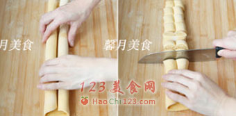 3、案板洒干粉,将面团擀开成大面片,表面刷油。自上下方将其向中间卷起,结合处刷一点水。切成约5厘米宽的小段。