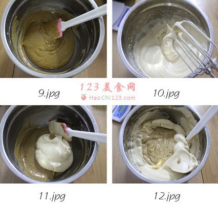 10、蛋白粉三次加入糖,打成干性发泡状态。