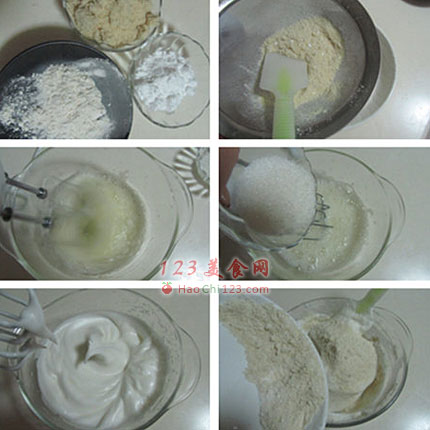2、蛋白分次加入糖打发,一定要将蛋白打发至能挺立很结实的状态;再分次加入过筛的面粉混合。