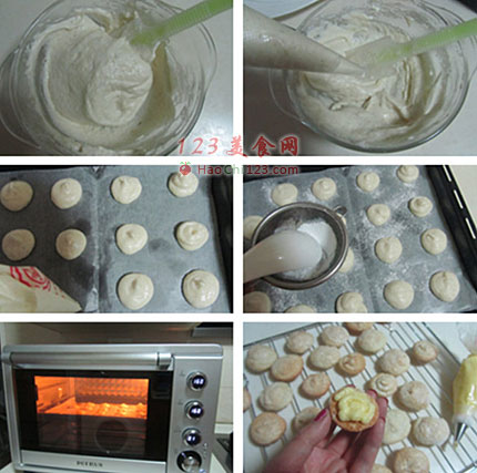 3、混合好的面糊放入裱花袋中,在烤盘上挤出大小一致的圆点;再在上面撒些糖粉,过5分钟再撒一次。