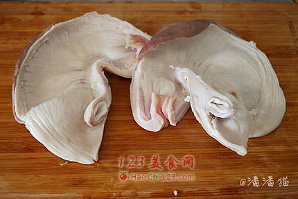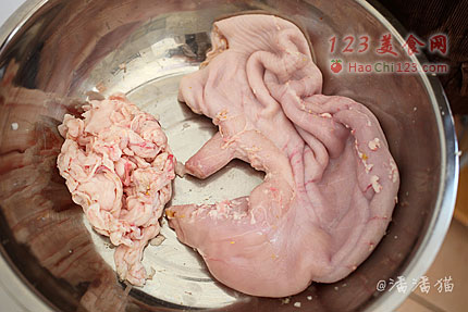 2、把猪肚翻过来,放入食用碱面搓洗。会洗出不少粘液,倒掉、冲洗一下继续再洗,洗3遍左右。