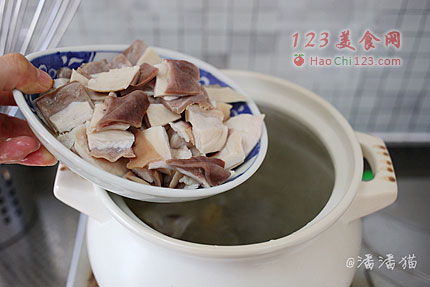 9、放入猪肚块,盖上锅盖中小火煮40分钟。