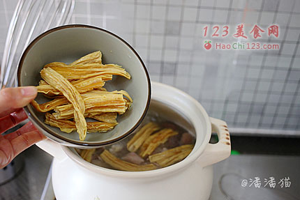 10、放入泡过的腐竹再煮30分钟,让腐竹变软。