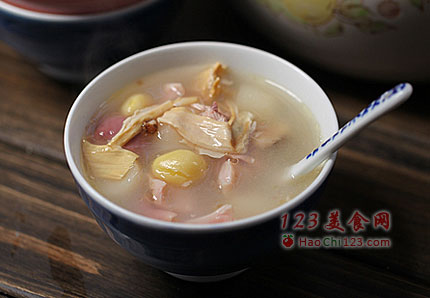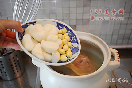 11、最后放入马蹄和白果,调入适量的盐再煮15-20分钟就可以享用了。