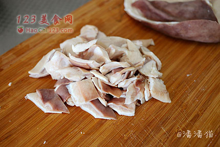 4、把煮好的猪肚切成片准备煲汤用。