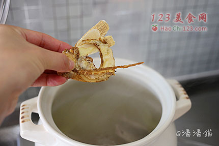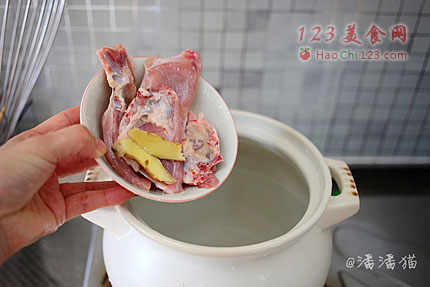 6、把鸡胯骨洗净和姜片一起放入砂锅中煲煮。