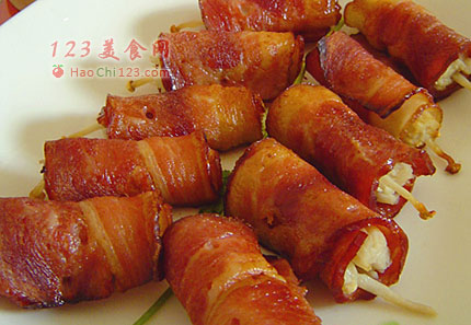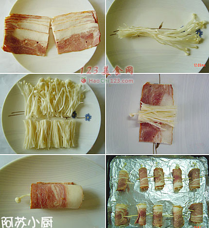 2、将金针菇段放在培根上,取一根稍微长一点的放在中间,然后卷起,用牙签固定。