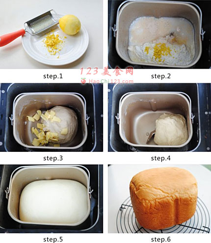 2、将除黄油以外的所有面团材料放入面包桶内。