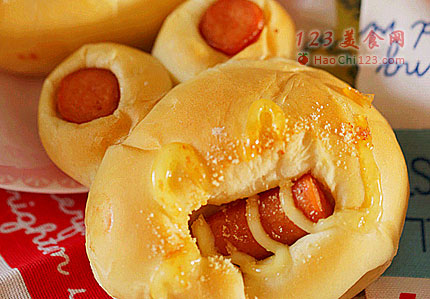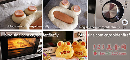 7、热狗先切成小圆片状,后放置在眼睛的部位;长条热狗剖半,放置在椭圆面团中心,成为嘴巴。