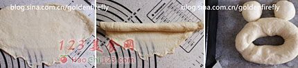 6、后将长面团接起,成为椭圆中空状,放置在铺有防沾考纸的烤盘上。另将小面团整形成小圆球,放置在椭圆面团上端,左右对称成为青蛙眼睛。