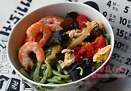 二、西红柿鲜虾面步骤:1、锅入油烧热,放入葱花、鸡蛋,炒好后放入西红柿榨菜丝翻炒。